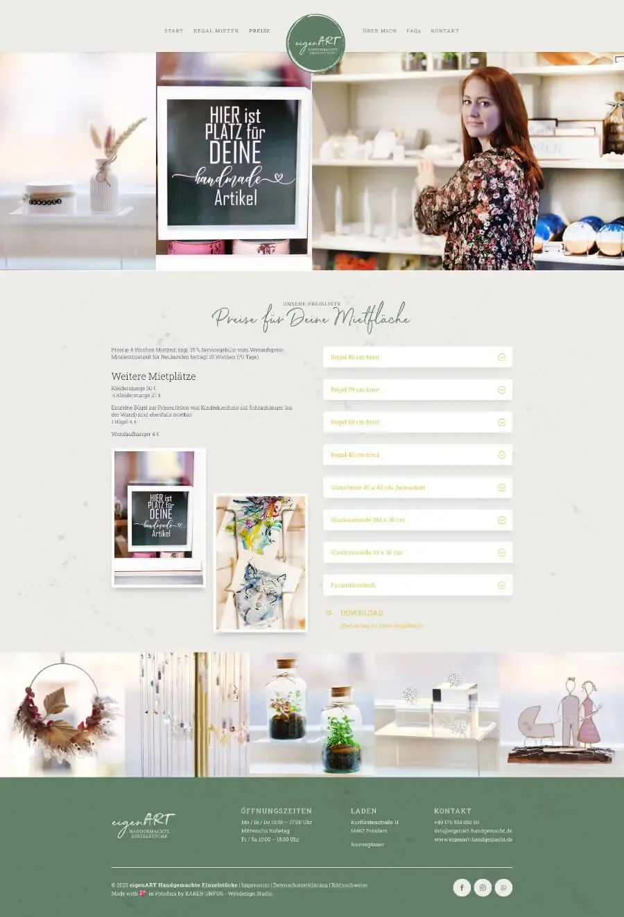 Mit eigenART schuf Lydia Jachalke eine zauberhafte Plattform für handgemachte Unikate und erfüllte sich ihren Traum von einem eigenen Laden im charmanten Holländischen Viertel von Potsdam. Um diesen Traum auch online sichtbar zu machen, entwickelten wir eine moderne One-Pager Website, die potenzielle Aussteller ansprach und gleichzeitig Kunden inspirierte, den Laden zu besuchen. Die Website kombinierte Stil und Funktionalität, um eigenARTs Einzigartigkeit und die Leidenschaft hinter den Produkten zu vermitteln. Obwohl das Geschäft inzwischen geschlossen ist, bleibt die Website ein schönes Beispiel für die Verbindung von Kreativität und Unternehmergeist – und für unser Engagement, kleine Träume groß rauszubringen.