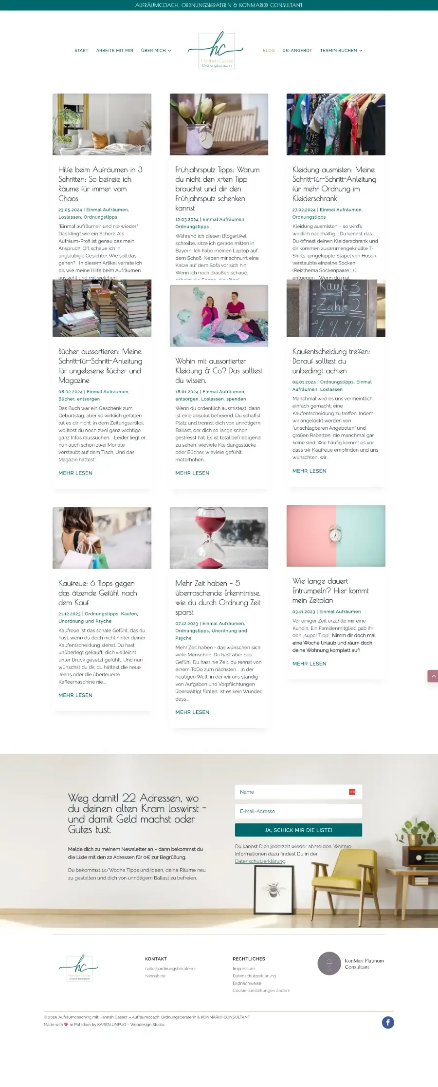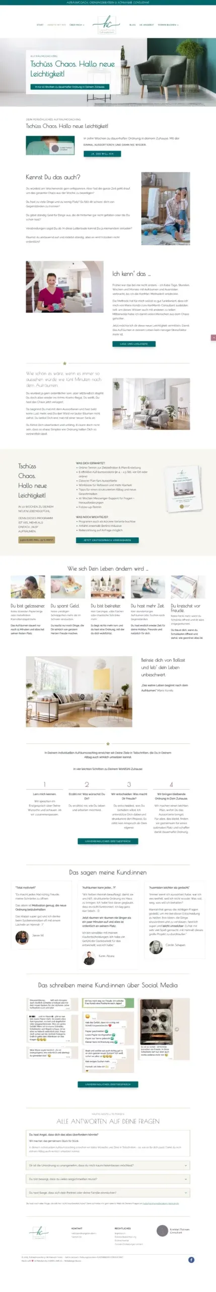 Hannah Cesarz hilft ihren Kunden dabei, mehr Ordnung und Leichtigkeit in ihr Leben zu bringen – und genau dieses Gefühl sollte auch ihre neue Website vermitteln. Beim Website-Relaunch haben wir besonderen Wert auf ein klares, modernes Design gelegt, das perfekt zu ihrer Philosophie passt. Die Inhalte wurden übersichtlich und ansprechend strukturiert, sodass Besucher sofort erkennen, wie Hannah sie unterstützen kann. Ob minimalistische Ästhetik oder praktische Funktionen – die neue Website strahlt die Expertise von Hannah aus und lädt dazu ein, den ersten Schritt zu einem ordentlicheren Leben zu machen. Ein Projekt, das genau das widerspiegelt, wofür ihre Arbeit steht: Klarheit, Struktur und Wohlbefinden.